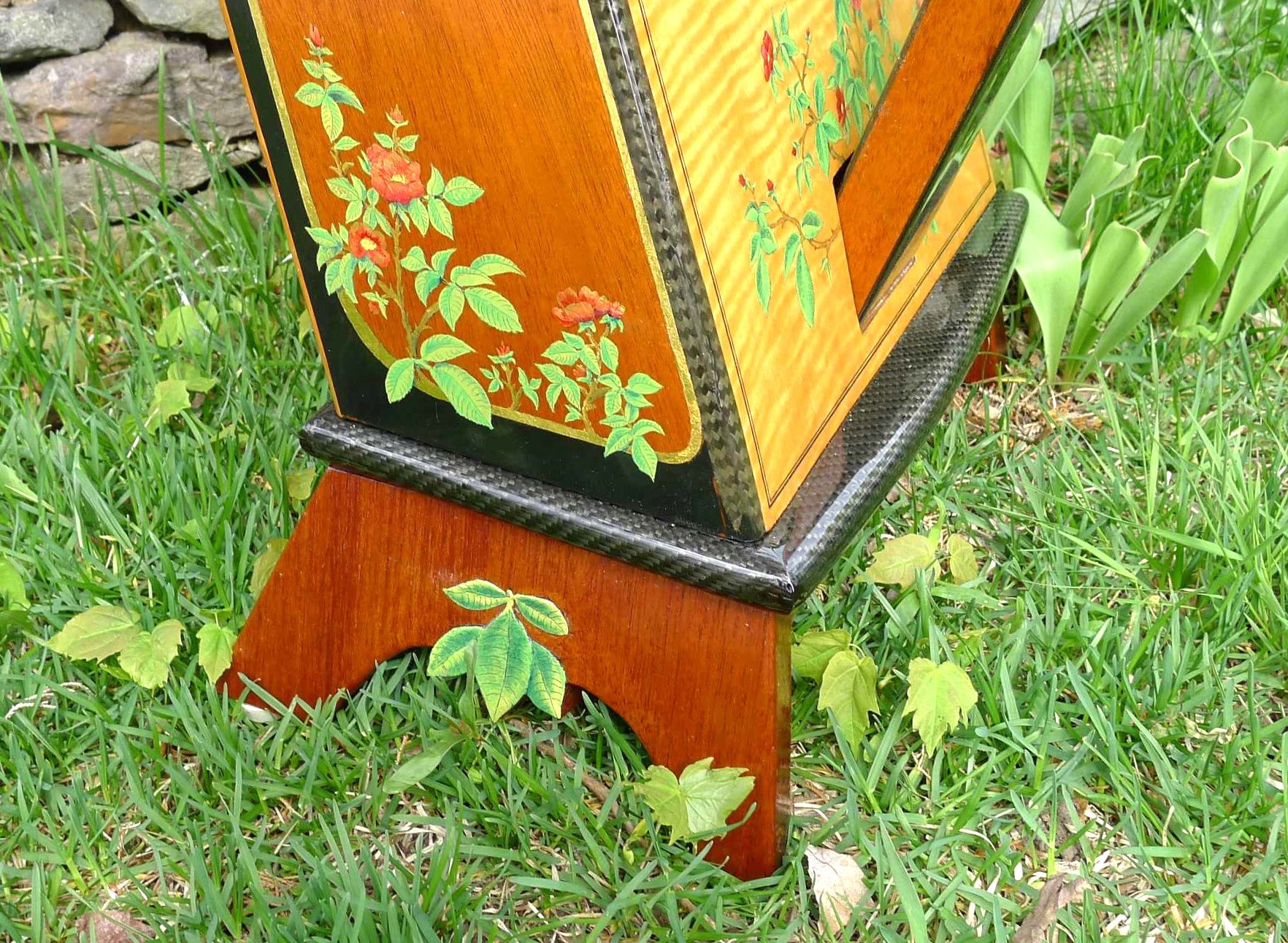 Black Diamond Harps takes traditional solid wood and combines it in a wood/epoxy/carbon fiber composite that produces a harp with the sound quality of a solid wood harp, but with the stable, strong and resilient qualities of carbon fiber. Each harp is then artistically finished to be a unique work of musical art.